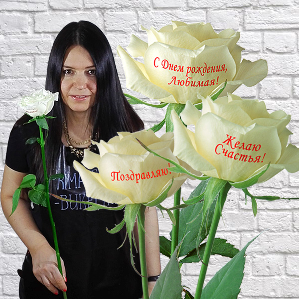 Премиальные эквадорские розы с надписью на лепестках Вместе с прекрасным цветком вы можете подарить ваши искренние чувства и пожелания! Для нанесения поздравительных надписей мы используем уникальную авторскую технологию.