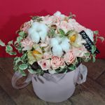 Букет №New-106 Кустовая роза, физалис и коробочки хлопка в шляпной коробочке